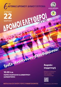 Ο Δήμος Βύρωνα, σε συνεργασία με τον Γυμναστικό Σύλλογο «Νίκη Βύρωνα», προσκαλεί μικρούς και μεγάλους την Κυριακή 22 Μαρτίου 2026, στον Αγώνα Δρόμου «Δρόμοι Ελεύθεροι».