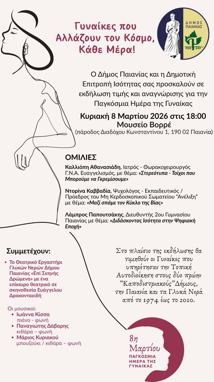 Mε αφορμή την Παγκόσμια Ημέρα της Γυναίκας ο Δήμος Παιανίας και η Δημοτική Επιτροπή Ισότητας διοργανώνουν την εκδήλωση «Γυναίκες που αλλάζουν τον κόσμο κάθε μέρα!», την Κυριακή 8 Μαρτίου 2026 και ώρα 18.00 στον ξεχωριστό χώρο του Μουσείου Βορρέ.
