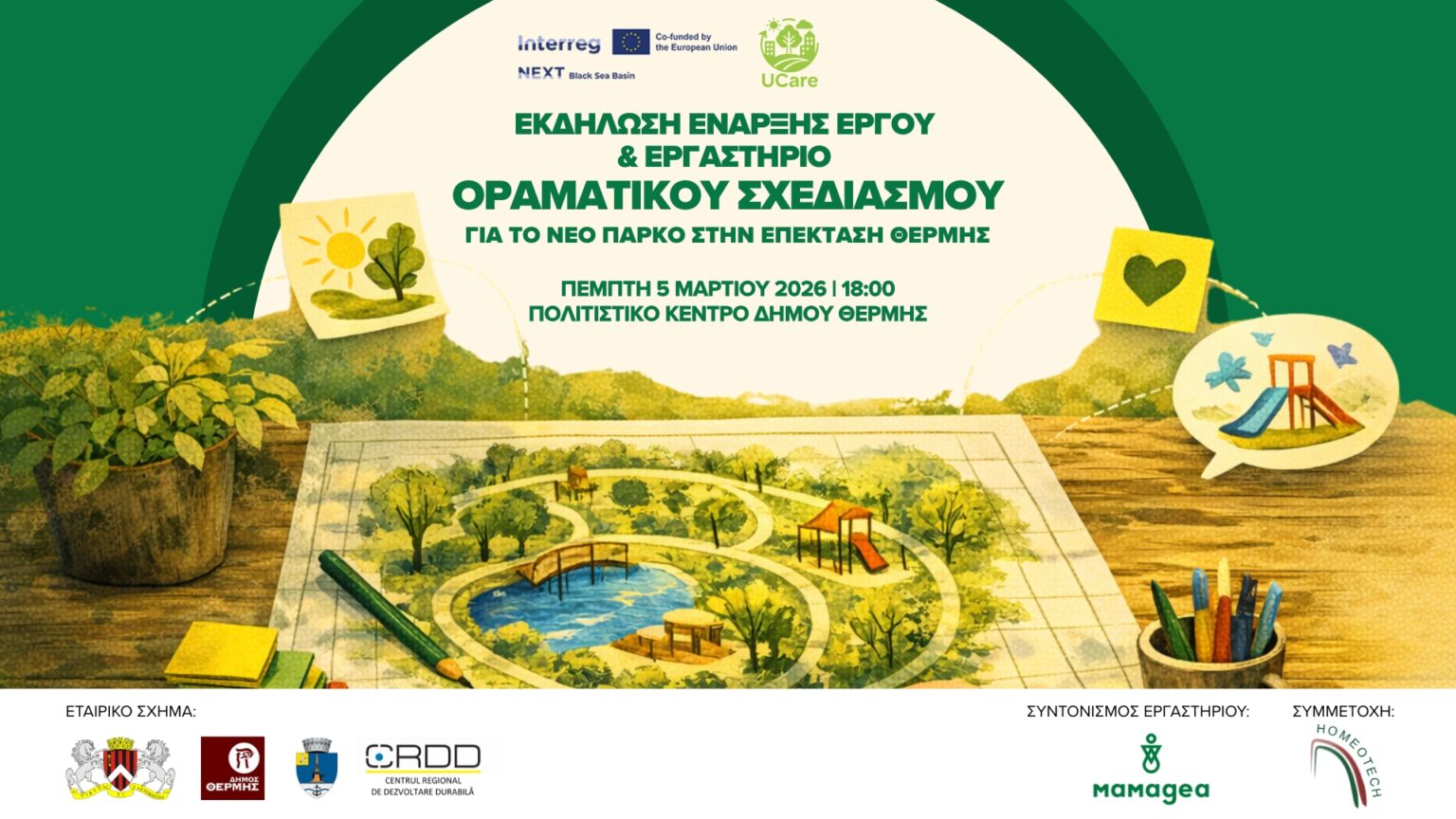 O Δήμος Θέρμης, η Περιβαλλοντική Οργάνωση Μαμαγαία και η Τεχνομοιόσταση, προσκαλούν τους κατοίκους της Θέρμης –και ιδιαίτερα της περιοχής επέκτασης– στην εναρκτήρια εκδήλωση του έργου UCare και στο ανοιχτό εργαστήριο συμμετοχικού οραματικού σχεδιασμού για το νέο πάρκο που δημιουργείται στον υπ’ αρ. 163 κοινόχρηστο χώρο.