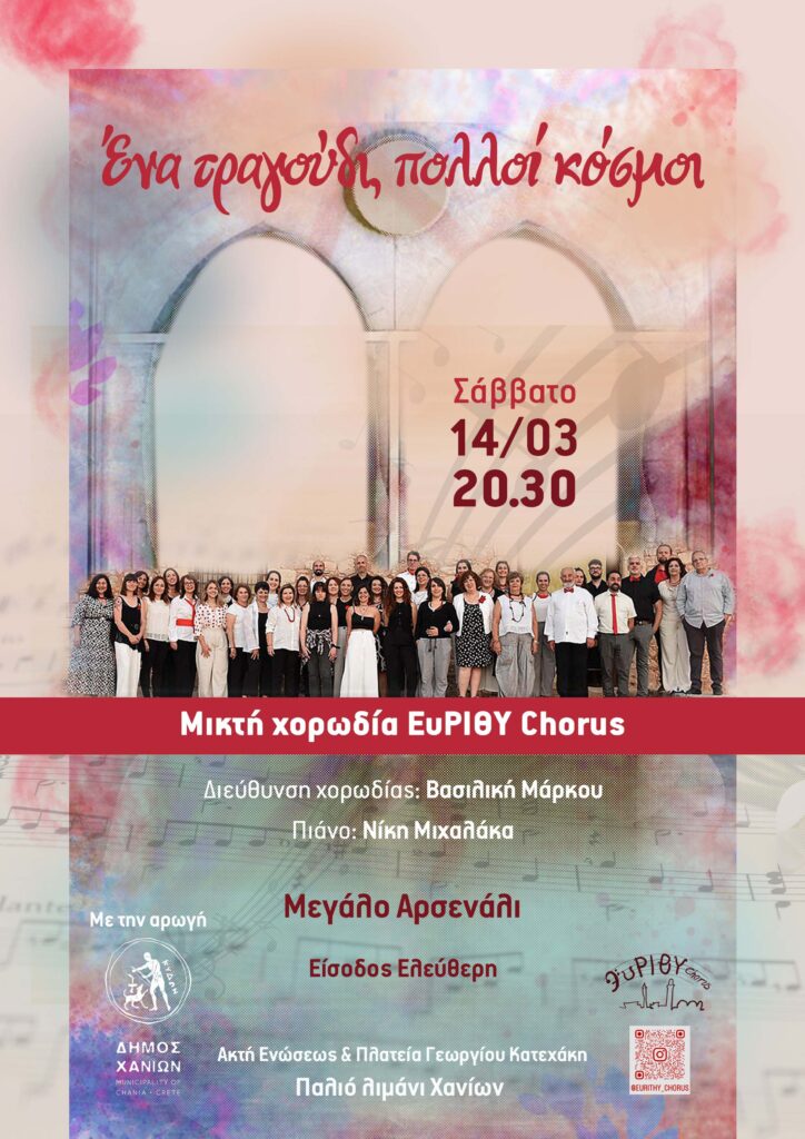 Η Μικτή Χορωδία ΕυΡΙΘΥ Chorus από το Ρέθυμνο έρχεται για πρώτη φορά στα Χανιά για μία και μοναδική συναυλία, το Σάββατο 14 Μαρτίου και ώρα 20:30, στο εμβληματικό Μεγάλο Αρσενάλι, στο Παλαιό Λιμάνι των Χανίων.