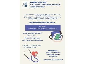 Η Αντιδημαρχία Κοινωνικής Πολιτικής & Δημόσιας Υγείας του Δήμου Λαγκαδά, σε συνεργασία με τον Δημοτικό Ιατρό κ. Χατζή Χρήστο, διοργανώνει ενημερωτική ομιλία με θέμα: «Αρτηριακή Υπέρταση – Μύθοι και Αλήθειες».