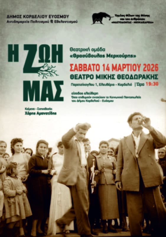 Η εκδήλωση θα πραγματοποιηθεί την παρακάτω ημερομηνία το Σάββατο 14 Μαρτίου 2026 στις 19:30 στο θέατρο «Μίκης Θεοδωράκης», Παρασκευοπούλου 1, Ελευθέριο – Κορδελιό.