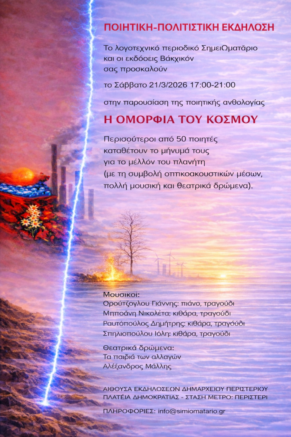 Το λογοτεχνικό περιοδικό ΣημειΩματάριο και οι εκδόσεις Βακχικόν σας προσκαλούν το Σάββατο 21 Μαρτίου 2026, από τις 17:00 έως τις 21:00, σε μια ξεχωριστή ποιητική και πολιτιστική εκδήλωση με τίτλο «Η Ομορφιά του Κόσμου».