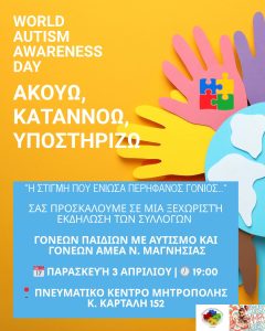 Με αφορμή την Παγκόσμια Ημέρα Αυτισμού, οι Σύλλογοι Γονέων Παιδιών με Αυτισμό και Σύλλογος Γονέων ΑμεΑ Ν. Μαγνησίας διοργανώνουν την Παρασκευή 3 Απριλίου και ώρα 19:00 εκδήλωσημε τίτλο «Η στιγμή που ένιωσα περήφανος γονιός» στο Πνευματικό Κέντρο της Μητρόπολης Δημητριάδος και Αλμυρού (Κ. Καρτάλη 152).