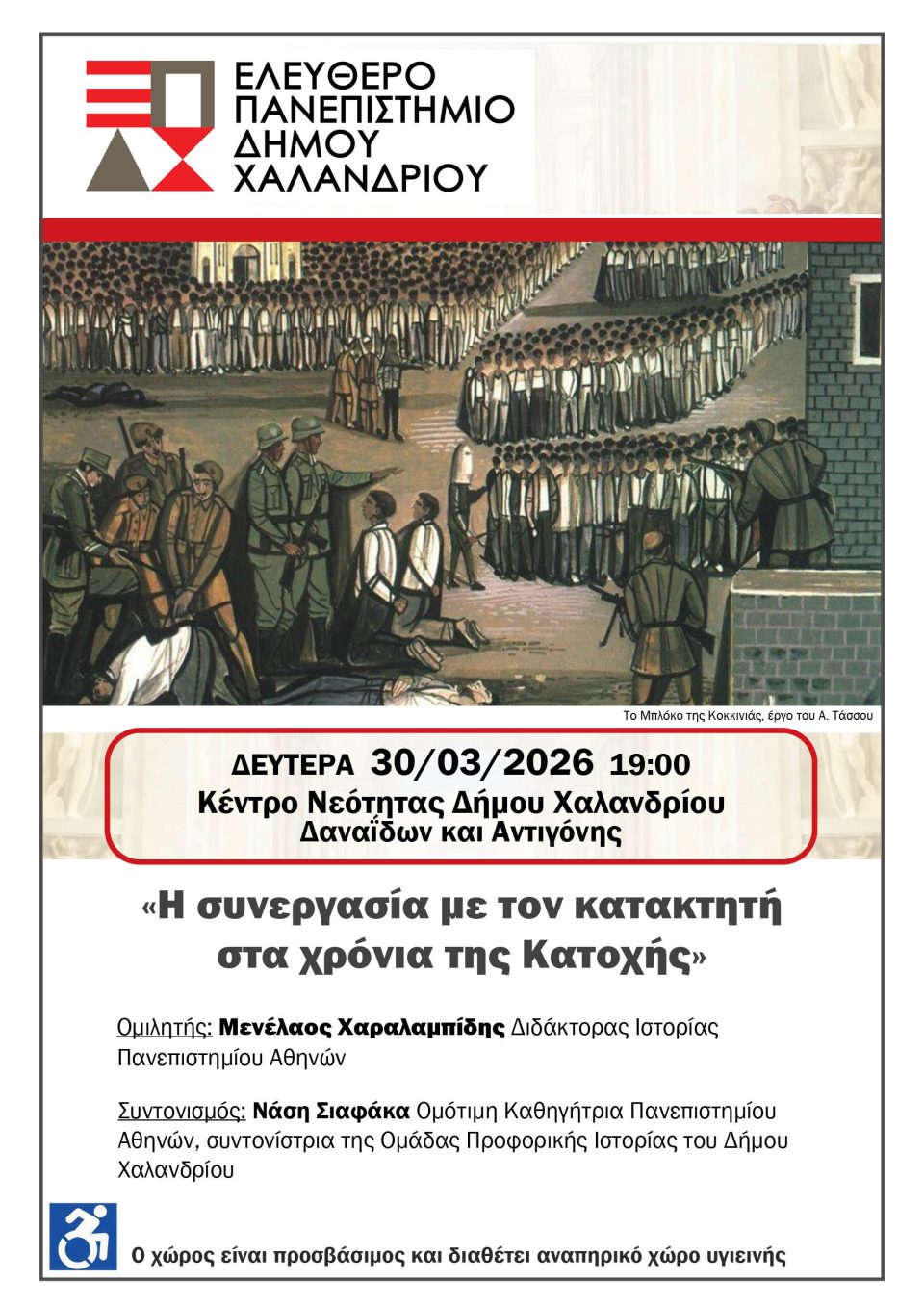 Τη  Δευτέρα 30/03/2026 και ώρα 19:00 στο Κέντρο Νεότητας (Δαναΐδων & Αντιγόνης) το Ελεύθερο Πανεπιστήμιο του Δήμου Χαλανδρίου δίνει ξανά βήμα στην Ιστορική Μνήμη με μια σπουδαία διάλεξη, με θέμα: «Η συνεργασία με τον κατακτητή στα χρόνια της Κατοχής»
