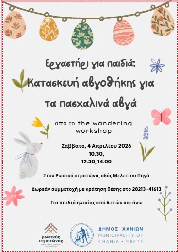 Ο Δήμος Χανίων διοργανώνει πασχαλινό εργαστήρι για παιδιά με θέμα την κατασκευή αβγοθήκης για τα πασχαλινά αυγά, στον χώρο του Ρωσικού Στρατώνα.