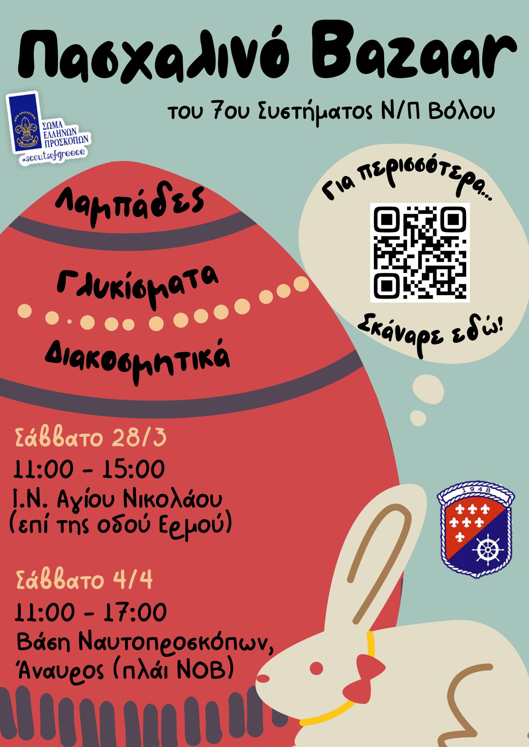 Το 7ο Σύστημα Ναυτοπροσκόπων Βόλου προσκαλεί μικρούς και μεγάλους στο καθιερωμένο Πασχαλινό Bazaar του, που διοργανώνει και φέτος με μεράκι, δημιουργικότητα και προσκοπικό πνεύμα.