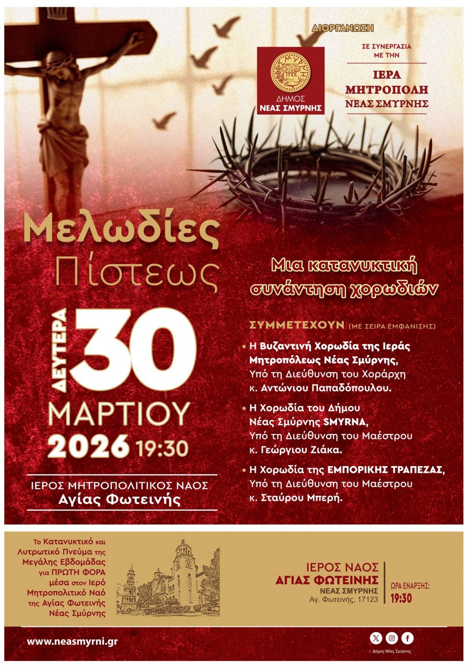Μια κατανυκτική συνάντηση χορωδιών διοργανώνει ο Δήμος Νέας Σμύρνης σε συνεργασία με την Ιερά Μητρόπολης Νέας Σμύρνης, την Δευτέρα 30 Μαρτίου, ώρα 19:30, στην Ιερό Μητροπολιτικό Ναό της Αγίας Φωτεινής.