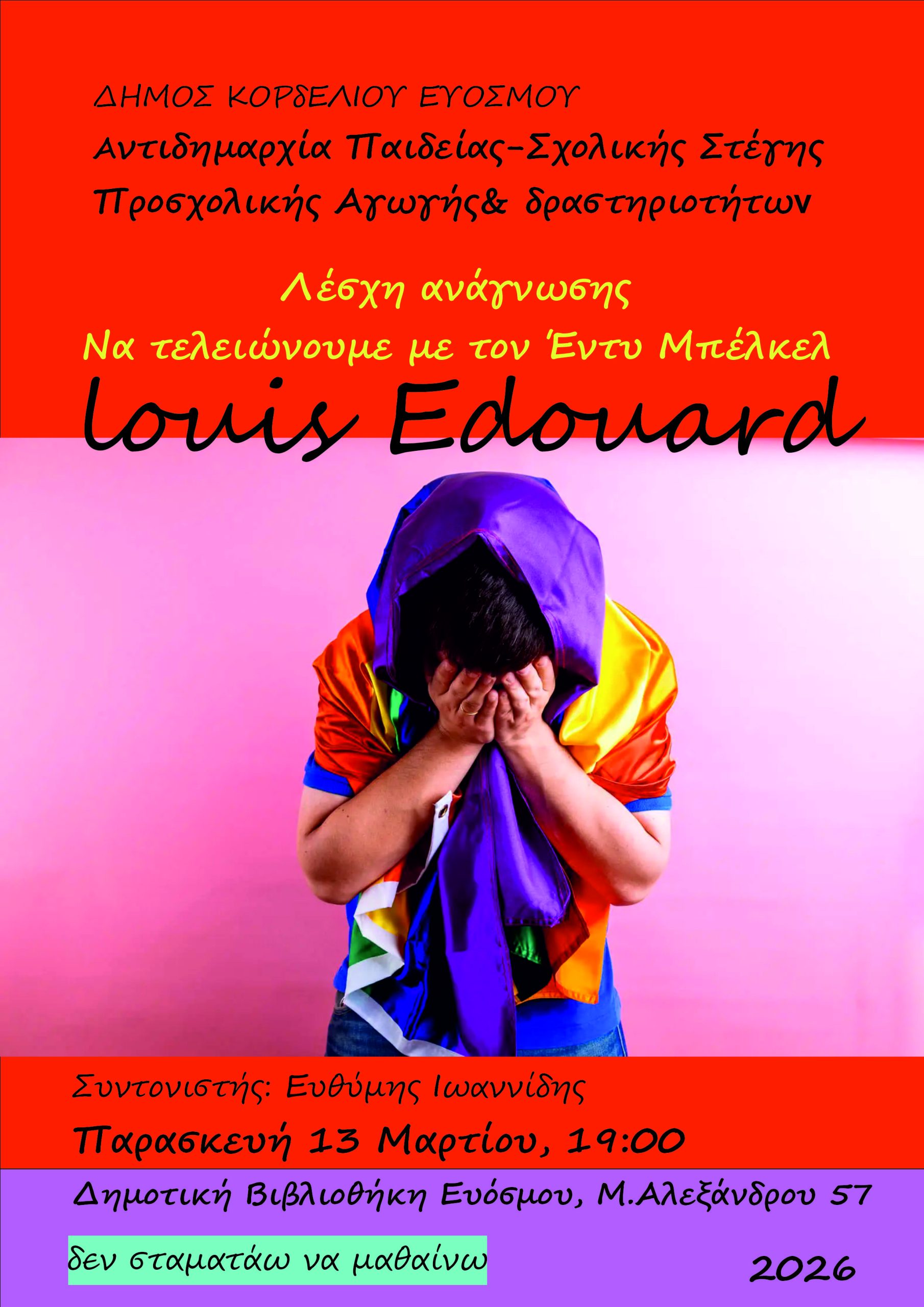 Το συγκλονιστικό συγγραφικό έργο του Εντουάρ Λουί «Να τελειώνουμε με τον Εντύ Μπελγκέλ», που θίγει με τόλμη ζητήματα ταυτότητας, κοινωνικού αποκλεισμού και προσωπικής χειραφέτησης, πραγματεύεται η νέα συνάντηση της Λέσχης Ανάγνωσης της Δημοτικής Βιβλιοθήκης Ευόσμου, που διοργανώνει η Αντιδημαρχία Παιδείας, Σχολικής Στέγης, Προσχολικής Αγωγής και Δραστηριοτήτων, την Παρασκευή 13 Μαρτίου στις 19.00 στο χώρο της Βιβλιοθήκης (Μ. Αλεξάνδρου 57).