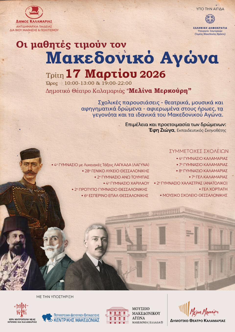 14 σχολεία της πόλης ανεβαίνουν στη σκηνή με θεατρικά, μουσικά και αφηγηματικά δρώμενα αφιερωμένα στους ήρωες, τα γεγονότα και τα ιδανικά του Μακεδονικού Αγώνα 1904-1908.