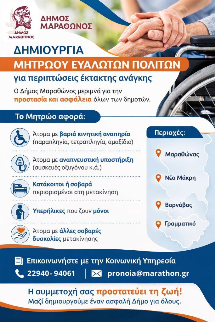 Ο Δήμος Μαραθώνος, μέσω του Αυτοτελούς Τμήματος Κοινωνικής Προστασίας, Παιδείας, Πολιτισμού και Αθλητισμού, προχωρά στη δημιουργία Μητρώου Ευάλωτων Πολιτών (ΑμεΑ) με στόχο την αποτελεσματικότερη προστασία καιυποστήριξη τους σε περιπτώσεις έκτακτης ανάγκης, όπως πυρκαγιές, πλημμύρες, σεισμοί, διακοπές ηλεκτροδότησης ή άλλα έκτακτα περιστατικά.