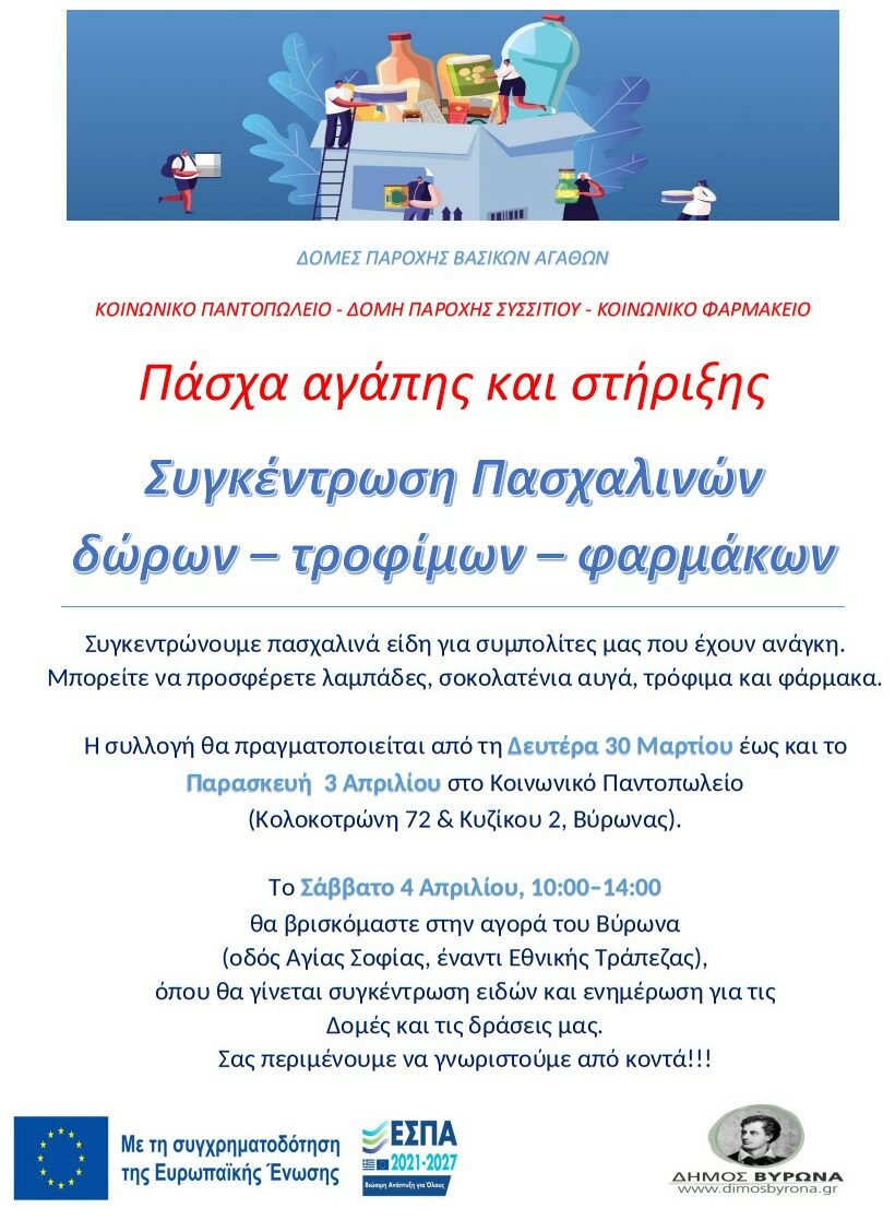 Με αφορμή τις Άγιες ημέρες του Πάσχα, ο Δήμος Βύρωνα, μέσω των Δομών Παροχής Βασικών Αγαθών (Κοινωνικό Παντοπωλείο, Δομή Παροχής Συσσιτίου και Κοινωνικό Φαρμακείο), διοργανώνει δράση συγκέντρωσης πασχαλινών δώρων, τροφίμων και φαρμάκων με στόχο τη στήριξη συμπολιτών μας που βρίσκονται σε ανάγκη.