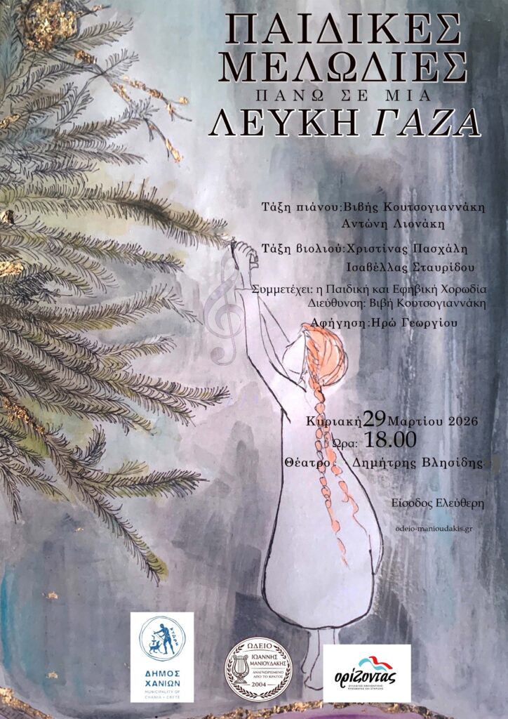 Το Ωδείο Ιωάννης Μανιουδάκης, σε συνεργασία με τον Δήμο Χανίων, παρουσιάζει μια ξεχωριστή μουσική εκδήλωση με πρωταγωνιστές τους μικρούς σπουδαστές του ωδείου, την Κυριακή 29 Μαρτίου 2026 και ώρα 18:00, στο Θέατρο «Δημήτρης Βλησίδης» με τον τίτλο: «Παιδικές Μελωδίες πάνω σε μια Λευκή Γάζα»