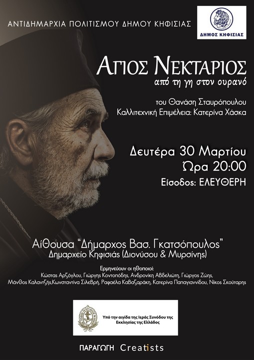 Στο πλαίσιο των κατανυκτικών ημερών που διανύουμε και καθώς οδεύουμε προς το Άγιο Πάσχα, η Αντιδημαρχία Πολιτισμού σας προσκαλεί σε ένα πνευματικό ταξίδι στα βήματα του Αγίου Νεκταρίου, μέσα από τη θεατρική παράσταση: «Άγιος Νεκτάριος, από τη γη στον ουρανό» του Θανάση Σταυρόπουλου, που θα παρουσιαστεί τη Δευτέρα 30 Μαρτίου 2026 στις 20.00 στην Αίθουσα «Δήμαρχος Βασ. Γκατσόπουλος» του Δημαρχείου Κηφισιάς (Διονύσου & Μυρσίνης).