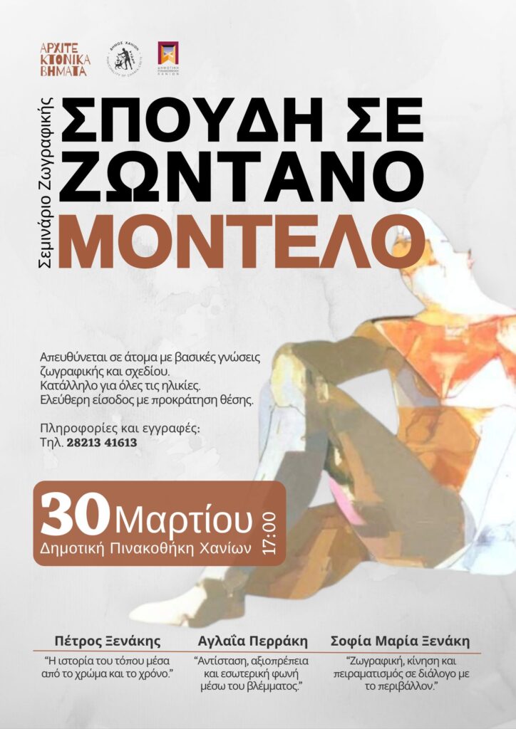 Στο πλαίσιο αυτό τη Δευτέρα 30 Μαρτίου 2026 στις 17.00 θα πραγματοποιηθεί Σεμινάριο Ζωγραφικής από Χανιώτες καλλιτέχνες που έχουν άμεση επαφή με το χώρο της Πινακοθήκης, έχουν εμπνευστεί, έχουν δημιουργήσει και έχουν εκθέσει τα έργα τους στον χώρο της.