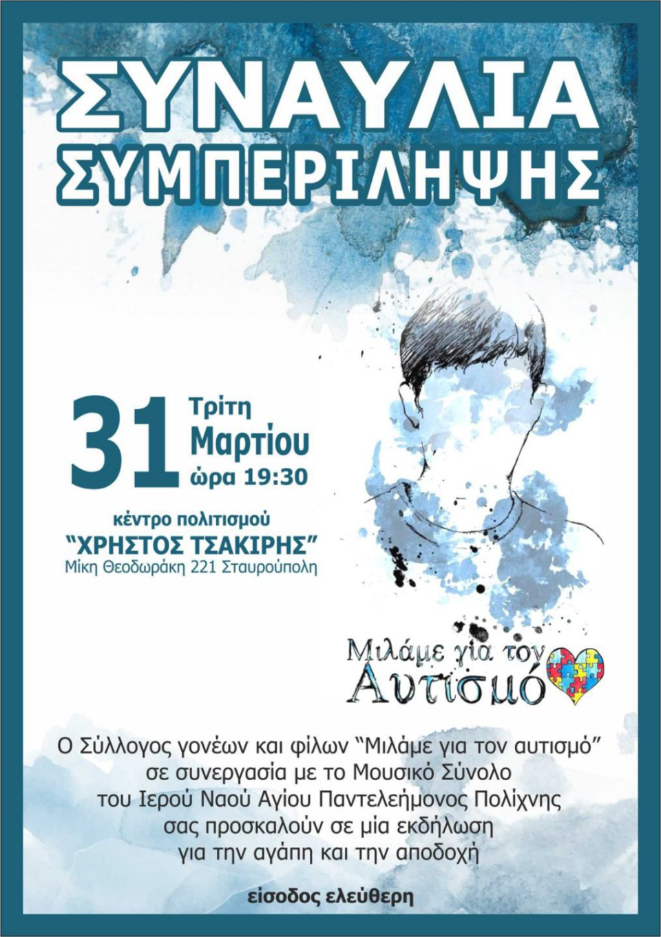 Ο Σύλλογος γονέων και φίλων «Μιλάμε για τον αυτισμό», σε συνεργασία με το Μουσικό Σύνολο του Ιερού Ναού Αγίου Παντελεήμονος Πολίχνης, διοργανώνουν μια ξεχωριστή Συναυλία Συμπερίληψης.