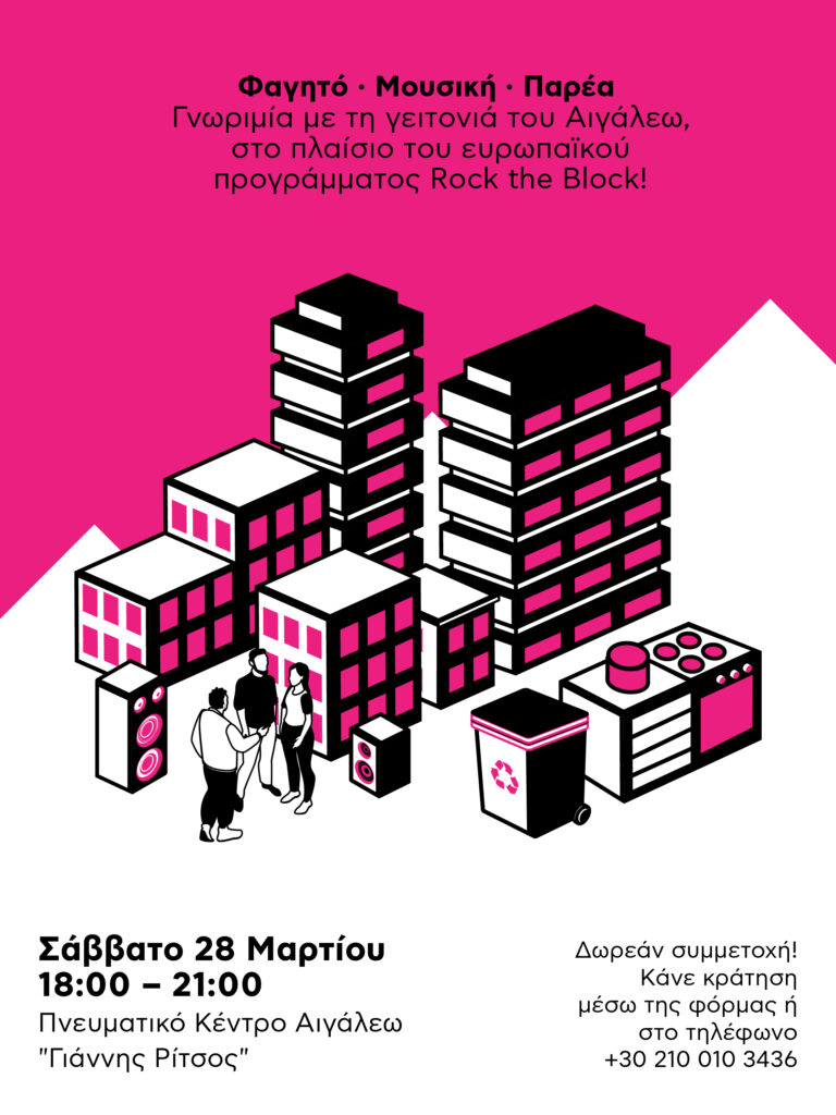 Το Ευρωπαϊκό Πρόγραμμα Rock the Block προσκαλεί τους κατοίκους του Αιγάλεω σε μια ανοιχτή γιορτή γειτονιάς, με στόχο τη γνωριμία, τη σύνδεση και την ενδυνάμωση των σχέσεων στην κοινότητα, καθώς και την ενημέρωση για τις επερχόμενες δράσεις αστικής ανάπλασης και βιωσιμότητας.