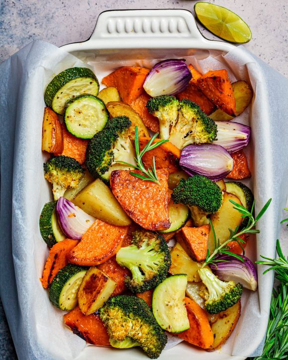- Απλώνουμε τα λαχανικά σε ταψί στρωμένο με αντικολλητικό χαρτί ψησίματος και τα ψήνουμε στο φούρνο για 25-30 λεπτά, ανακατεύοντας μια φορά στα μισά του χρόνου.