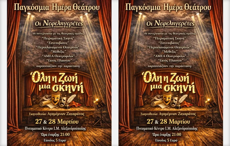 Οι “Νεφεληγερέτες” σε συνεργασία με τις θεατρικές ομάδες “Πειραματική Σκηνή”, “Συνεπιβάτες”, “Περιπλανώμενοι Θεατρίνοι” “Μέθεξη”, “ΑΜΕΑ Θεατρόφιλοι”, “Εκτός Πλαισίου” με αφορμή την Παγκόσμια Ημέρα Θεάτρου παρουσιάζουν την παράσταση «Όλη η ζωή μια σκηνή» σε σκηνοθεσία του Αγαμέμνονα Ζαχαράτου, την Παρασκευή 27 και το Σάββατο 28 Μαρτίου 2026 στις 21:00 στο Πνευματικό Κέντρο της Ιεράς Μητρόπολης Αλεξανδρούπολης.