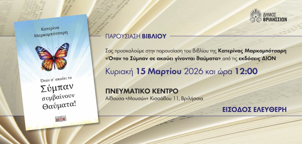 Το βιβλίο της Κατερίνας Μαρκομπότσαρη με τίτλο «Όταν το Σύμπαν σε ακούει γίνονται θαύματα», που κυκλοφορεί από τις Εκδόσεις ΔΙΟΝ παρουσιάζεται την Κυριακή 15 Μαρτίου 2026 και ώρα 12:00, στο Πνευματικό Κέντρο Βριλησσίων, στην αίθουσα «Μουσών» (Κισσάβου 11) στα Βριλήσσια.