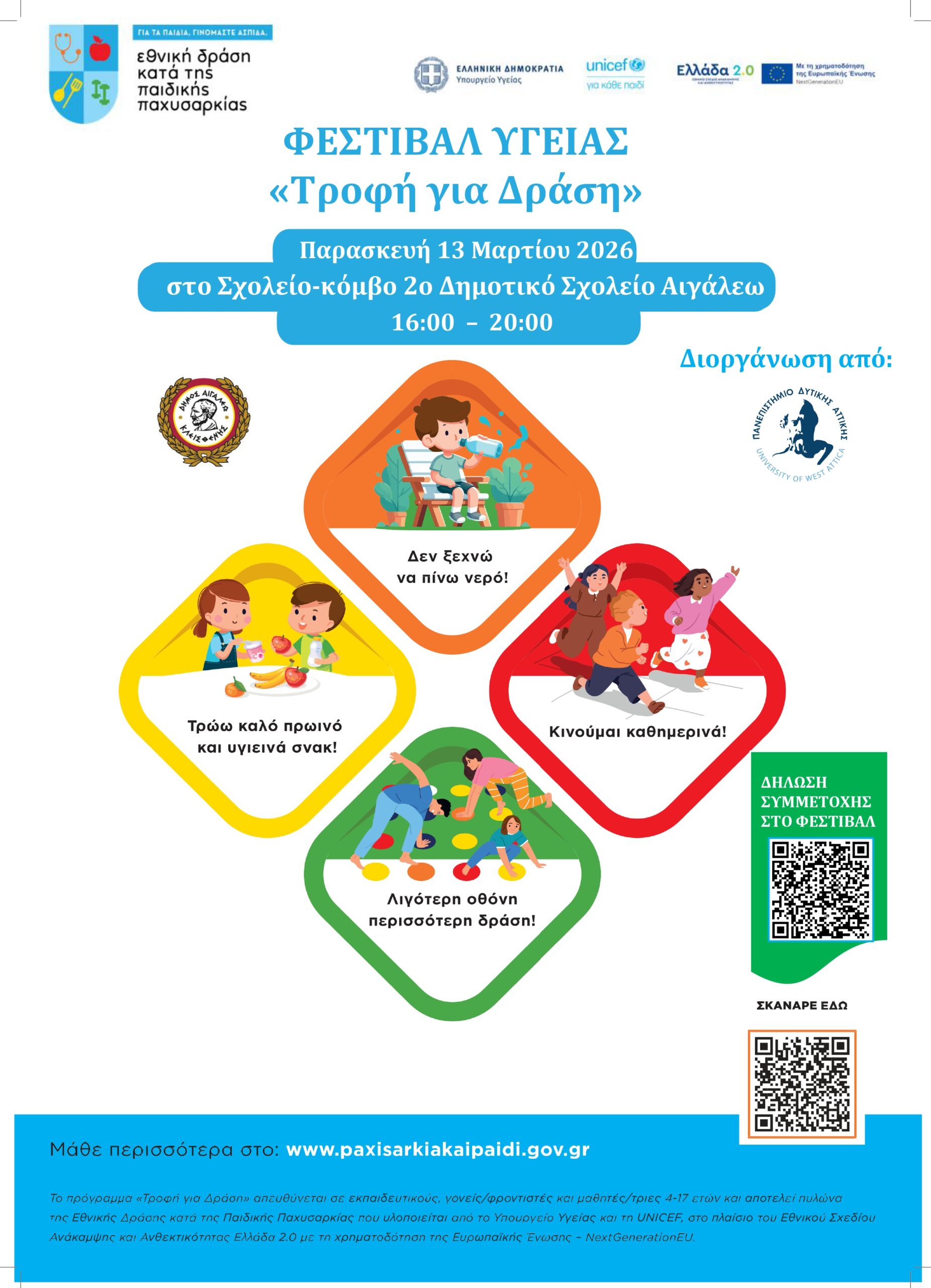 Ο Δήμος Αιγάλεω, σε συνεργασία με την Ερευνητική Ομάδα του Πανεπιστημίου Δυτικής Αττικής (ΠΑΔΑ), διοργανώνει το 2ο Φεστιβάλ Υγείας με τίτλο «Γνωριμία με τις Εργαλειοθήκες – Τροφή για Δράση», την Παρασκευή 13 Μαρτίου 2026, από τις 16:00 έως τις 20:00, στο 2ο Δημοτικό Σχολείο Αιγάλεω «Νίκος Γκάτσος».