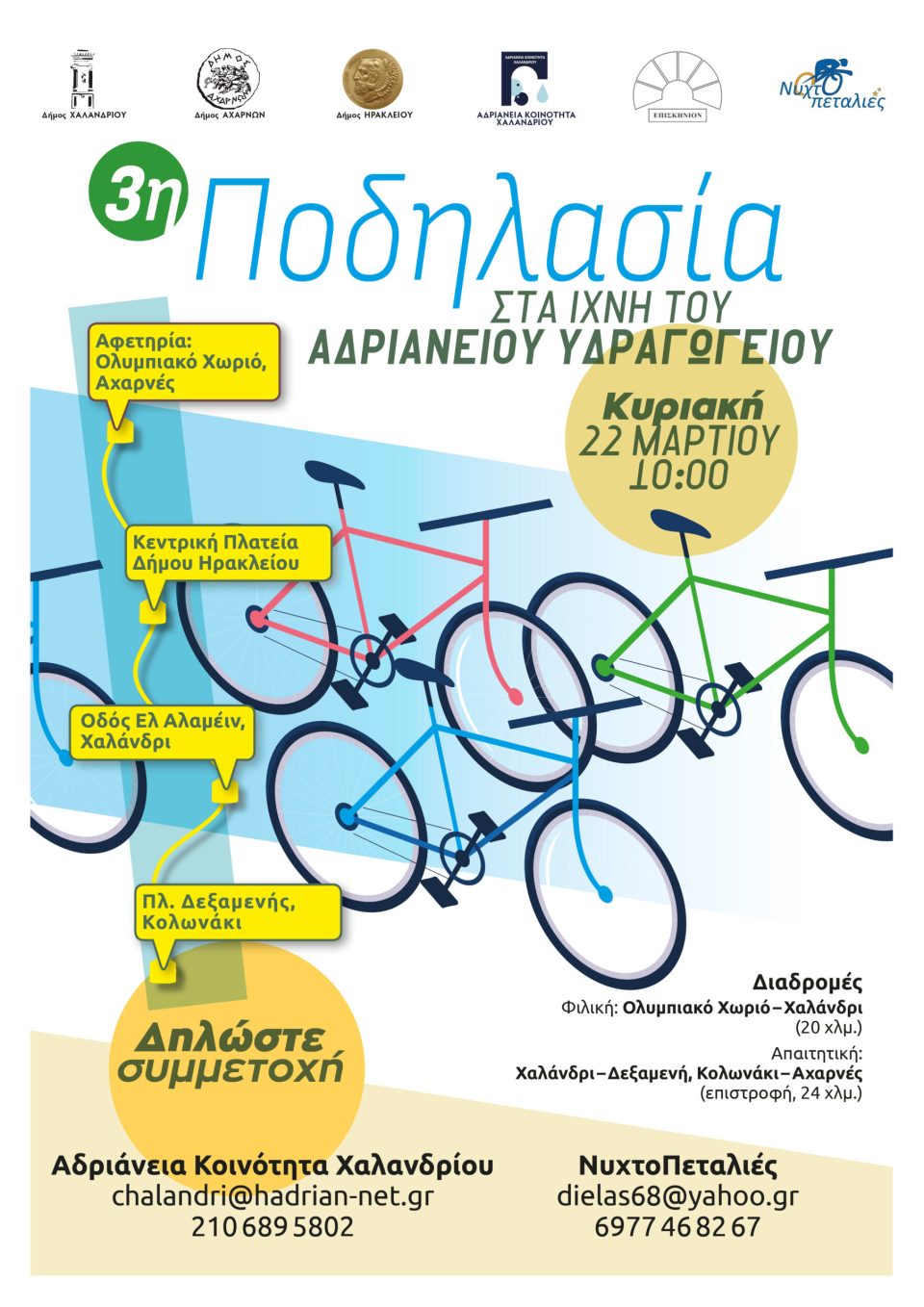 Για τρίτη χρονιά οι Δήμοι Χαλανδρίου, Αχαρνών και Ηρακλείου συνδιοργανώνουν μαζί με την Αδριάνεια Κοινότητα Χαλανδρίου, το Σύλλογο «Επισκήνιον» για την ανάδειξη του Αρχαίου Θεάτρου Αχαρνών και την ποδηλατική ομάδα Νυχτοπεταλιές, ποδηλασία ακολουθώντας την πορεία του Αδριάνειου υδραγωγείου με αφορμή την Παγκόσμια Ημέρα Νερού.