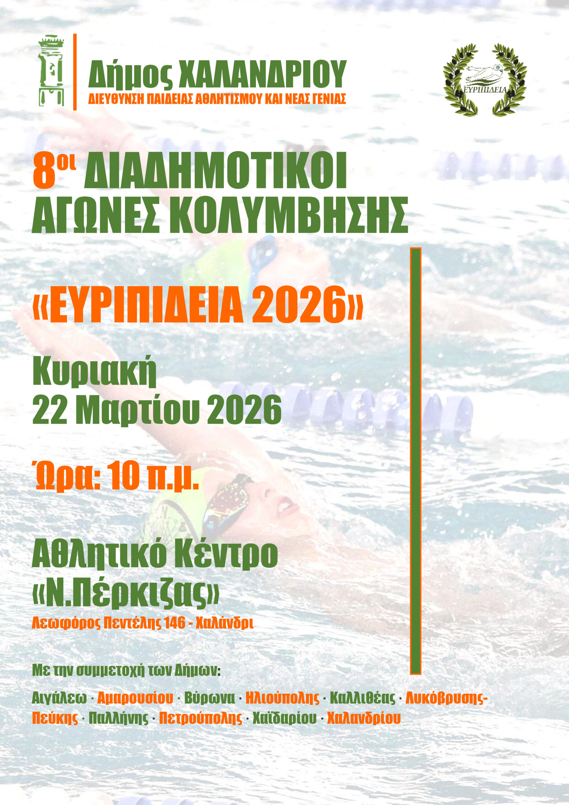 Για όγδοη συνεχή χρονιά, ο Δήμος Χαλανδρίου διοργανώνει τους Διαδημοτικούς Αγώνες Κολύμβησης, στο πλαίσιο των “Ευριπίδειων 2026”.