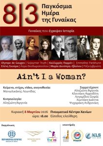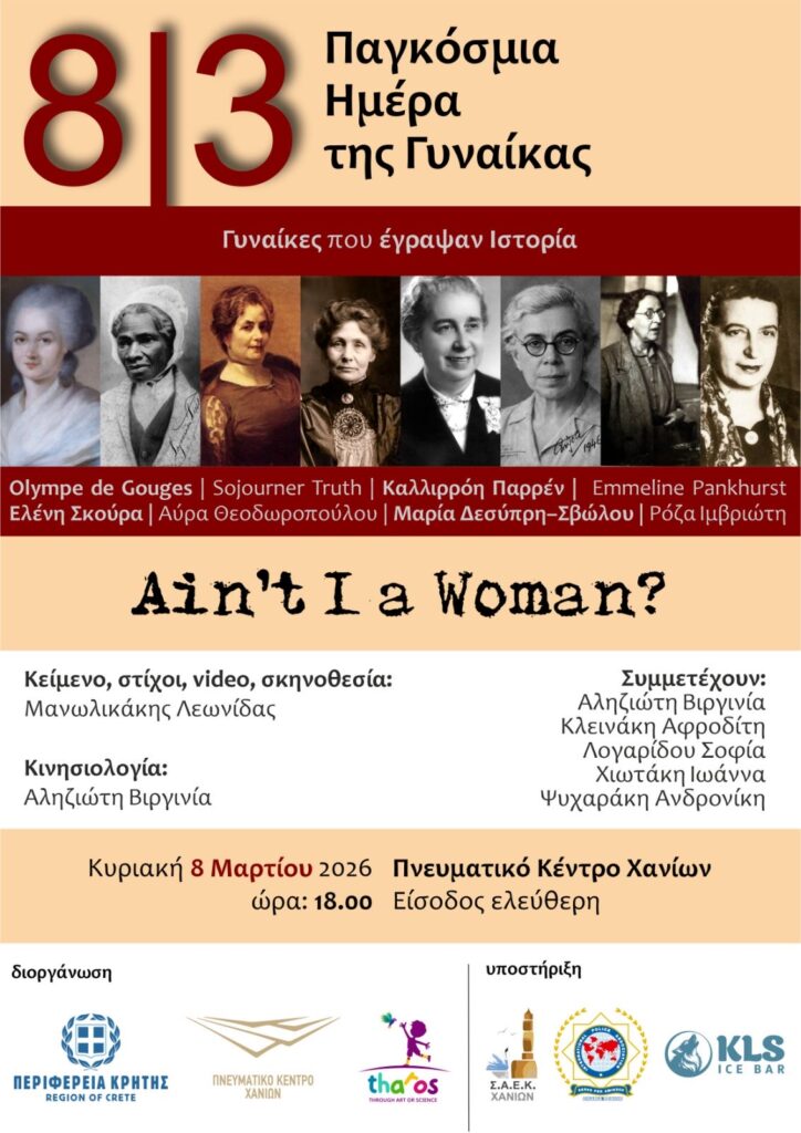 Με αφορμή την Παγκόσμια Ημέρα της Γυναίκας, την Κυριακή 8 Μαρτίου 2026 και ώρα 18:00, στο Πνευματικό Κέντρο Χανίων, παρουσιάζεται το θεατρικό δρώμενο «8 Γυναίκες που Έγραψαν Ιστορία: Ain’t I a Woman?» με ελεύθερη είσοδο για το κοινό.