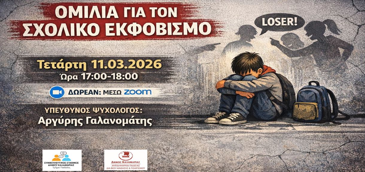 Ο Δήμος Καλαμαριάς στο πλαίσιο λειτουργίας του Συμβουλευτικού Σταθμού για Γονείς, Παιδιά και Εφήβους, διοργανώνει ενημερωτική ομιλία με θέμα «Σχολικός Εκφοβισμός», με στόχο την ενημέρωση και ευαισθητοποίηση της εκπαιδευτικής κοινότητας και των γονέων.
