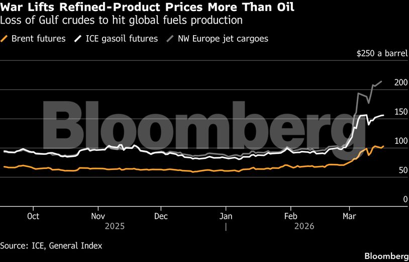 «Κανένα προϊόν ή γεωγραφική περιοχή δεν είναι πλήρως προστατευμένο», σημειώνουν οι αναλυτές της Goldman Sachs. Ο πόλεμος έχει περιορίσει τη δυνατότητα των παραγωγών του Περσικού Κόλπου να εξάγουν διυλισμένα προϊόντα, προκαλώντας διακοπές λειτουργίας σε διυλιστήρια και μειώνοντας τις ροές τύπων αργού που είναι καταλληλότεροι για την παραγωγή καυσίμων όπως το ντίζελ.