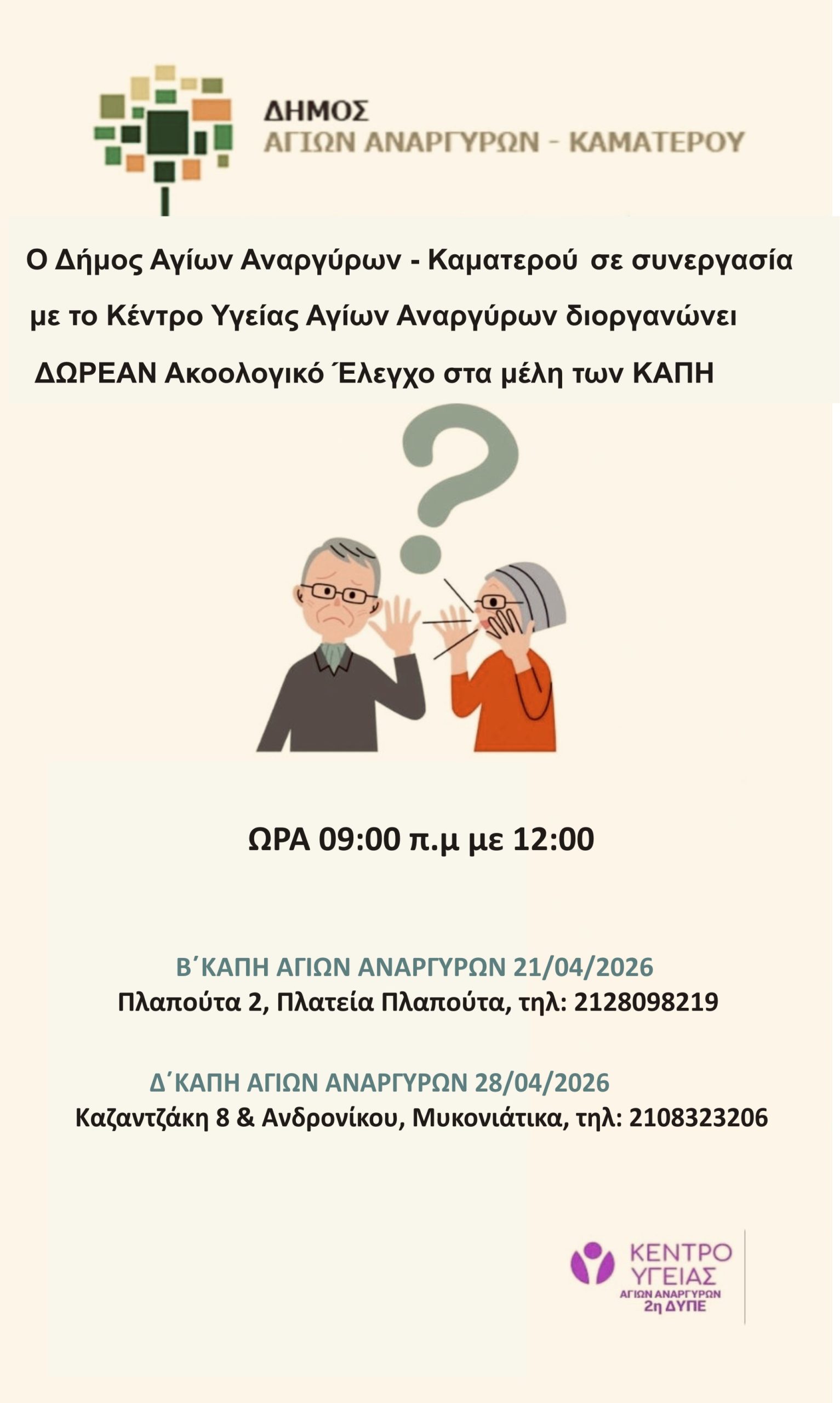 Η Κοινωνική Υπηρεσία του Δήμου Αγίων Αναργύρων- Καματερού και το γραφείο Προαγωγής Υγείας, σε συνεργασία με το Κέντρο Υγείας Αγίων Αναργύρων, πραγματοποιεί ΔΩΡΕΑΝ Ακοολογικό Έλεγχο στα μέλη των ΚΑΠΗ.