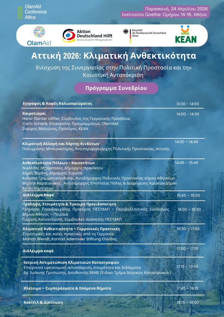 Το KEAN, η OlamAid και η Γερμανική Πρεσβεία στην Αθήνα σας προσκαλούν σε ένα σημαντικό συνέδριο αφιερωμένο στις σύγχρονες προκλήσεις και τις μελλοντικές προοπτικές της αστικής ανθεκτικότητας: