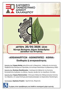Τη Δευτέρα 20/04/2026 και ώρα 19:00 στο Κέντρο Νεότητας (Δαναΐδων & Αντιγόνης) το Ελεύθερο Πανεπιστήμιο του Δήμου Χαλανδρίου φιλοξενεί την ενδιαφέρουσα όσο και σημαντική εκδήλωση με θέμα: «Αποανάπτυξη- κοινότητες- κοινά» Επιθυμία ή αναγκαιότητα;
