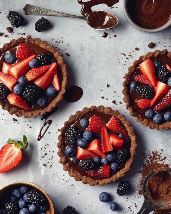 - Για τις ατομικές τάρτες σοκολάτας με γκανάζ και φρούτα του δάσους κοσκινίζουμε το αλεύρι και το κακάο στον κάδο του μίξερ, ρίχνουμε τα κυβάκια του βουτύρου, τη ζάχαρη άχνη και το αλάτι. Χτυπάμε με το φτερό στη χαμηλή ταχύτητα, να ενωθούν τα υλικά και να γίνουν ένα μείγμα σαν ψίχουλα.
