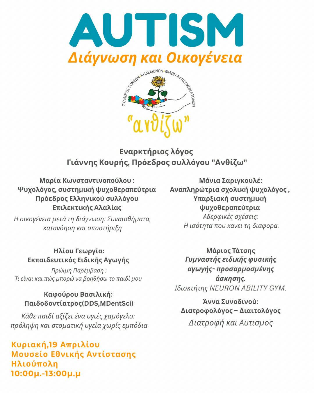 Η Ημερίδα που διοργανώνει ο Σύλλογος Γονέων, Κηδεμόνων & Φίλων Αυτιστικών Ατόμων «ΑνθίΖω» με την υποστήριξη του Δήμου Ηλιούπολης είναι αφιερωμένη στην ουσιαστική ενημέρωση, την κατανόηση και την έμπρακτη υποστήριξη των οικογενειών, με την συμμετοχή εξειδικευμένων επιστημόνων.
