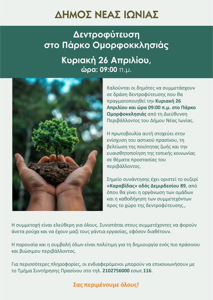 Την Κυριακή 26 Απριλίου, από τις 09:00 π.μ. ο Δήμος Νέας Ιωνίας διοργανώνει δράση δενδροφύτευσης στο Πάρκο Ομορφοκκλησιάς