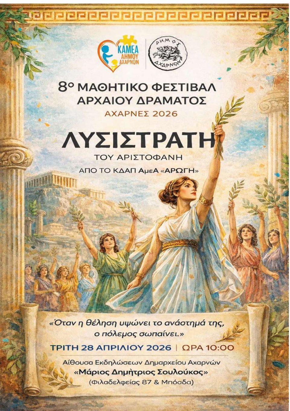 Την Τρίτη 28 Απριλίου 2026 στις 10:00 η “Αρωγή” θα παρουσιάσει τη δική της παράσταση βασισμένη στη “Λυσιστράτη” του Αριστοφάνη, στέλνοντας το διαχρονικό μήνυμα του ποιητή: “Όταν η θέληση υψώνει το ανάστημά της, ο πόλεμος σωπαίνει”.