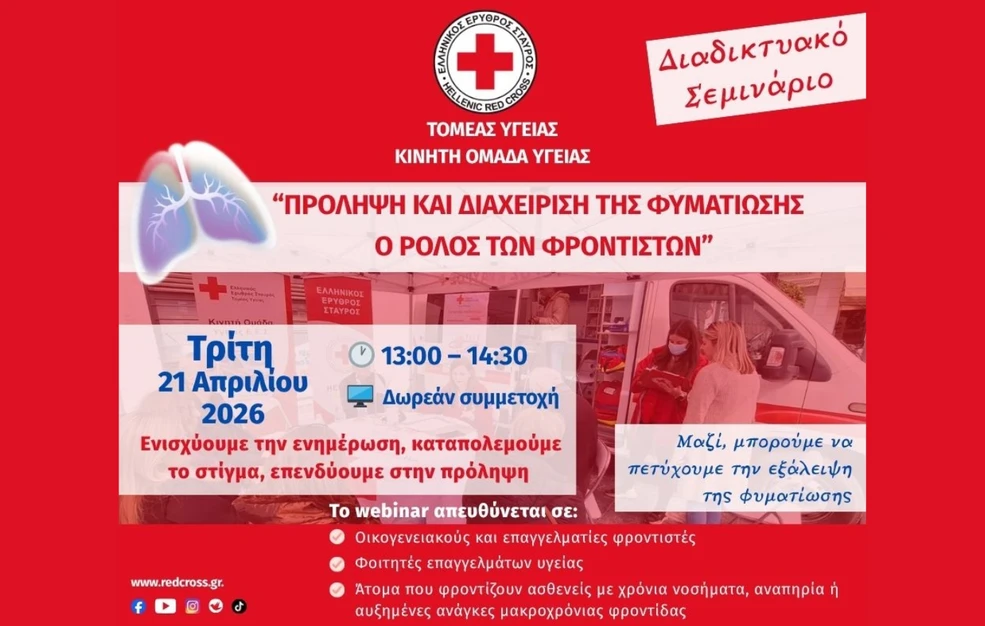 Ο Ελληνικός Ερυθρός Σταυρός, στο πλαίσιο της συνεχούς ενημέρωσης για την προαγωγή της δημόσιας υγείας, διοργανώνει διαδικτυακό εκπαιδευτικό σεμινάριο με τίτλο: «Πρόληψη και διαχείριση της φυματίωσης: Ο Ρόλος των Φροντιστών», την Τρίτη 21 Απριλίου 2026 και ώρες 13:00–14:30, με ελεύθερη συμμετοχή για το κοινό.