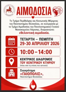 Με βαθιά αίσθηση ευθύνης και αλληλεγγύης, το Γυμνάσιο Ιωλκού με την αρωγή και την συνεργασία του 26ου Δημοτικού Βόλου, του Δημοτικού Ιωλκού και του Κέντρου Πολιτισμού «Ιωλκός» απευθύνει θερμή πρόσκληση προς γονείς, κηδεμόνες και όλα τα μέλη της τοπικής κοινωνίας Αγίου Ονουφρίου, Αγίου Γεωργίου και Αγίας Παρασκευής να συμμετάσχουν σε μια πράξη ζωής: την εθελοντική αιμοδοσία που θα πραγματοποιηθεί την Πέμπτη 30 Απριλίου 2026 9 π.μ.-1 μ.μ., στον χώρο του σχολείου – Γυμνάσιο Ιωλκού.