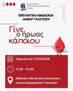 Την Παρασκευή 17 Απριλίου 2026, 09:30 με 13:30, θα πραγματοποιηθεί εθελοντική αιμοδοσία κατόπιν ραντεβού, στο ισόγειο του Δημαρχείου, στην αίθουσα «Θάνος Κωτσόπουλος».