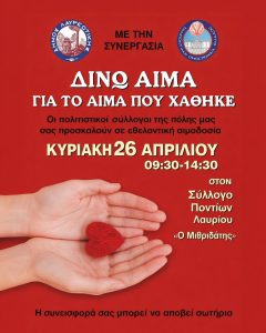 Η Παμποντιακή Ομοσπονδία Ελλάδος, σας προσκαλεί να συμμετάσχετε στην εθελοντική αιμοδοσία που διοργανώνει σε συνεργασία με τον Δήμο Λαυρεωτικής και τους Πολιτιστικούς Συλλόγους της πόλης.