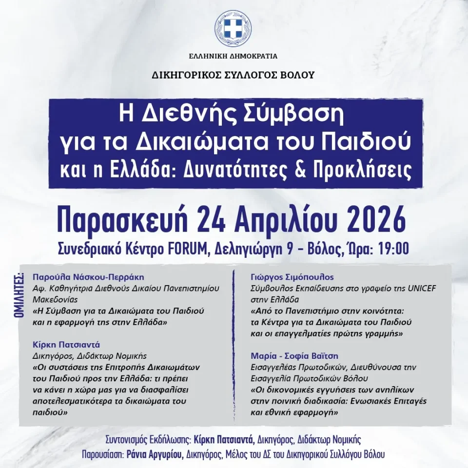Ο Δικηγορικός Σύλλογος Βόλου σας προσκαλεί σε μια εξαιρετικά επίκαιρη εκδήλωση με θέμα «Η Διεθνής Σύμβαση για τα Δικαιώματα του Παιδιού και η Ελλάδα: Δυνατότητες & Προκλήσεις».