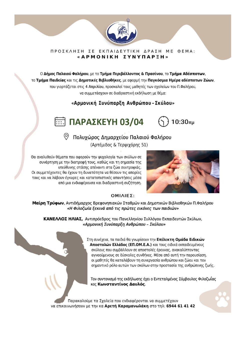 Με αφορμή την Παγκόσμια Ημέρα Αδέσποτων Ζώων, που τιμάται κάθε χρόνο στις 4 Απριλίου, ο Δήμος Παλαιού Φαλήρου διοργανώνει εκπαιδευτική και διαδραστική δράση με θέμα «Αρμονική Συνύπαρξη Ανθρώπου – Σκύλου», απευθυνόμενη στους μαθητές των σχολείων της πόλης.