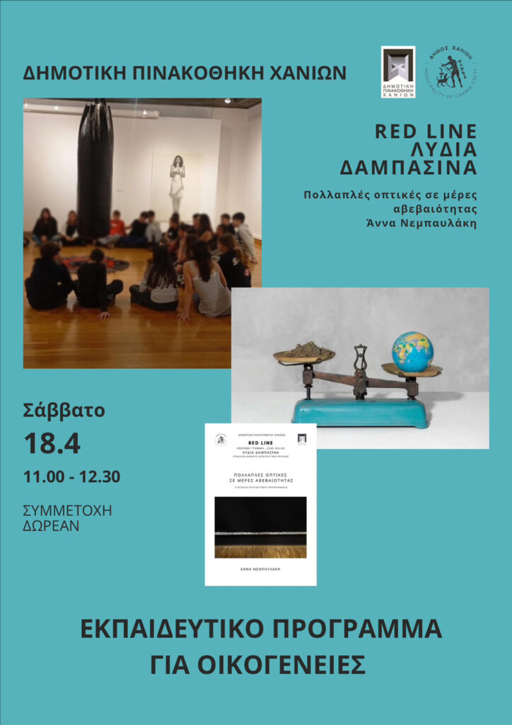 Η Δημοτική Πινακοθήκη Χανίων και ο Δήμος Χανίων προσκαλούν οικογένειες να συμμετάσχουν σε ένα δημιουργικό και βιωματικό εκπαιδευτικό πρόγραμμα, που πραγματοποιείται με αφορμή την έκθεση «Red Line» της Λυδίας Δαμπασίνα.