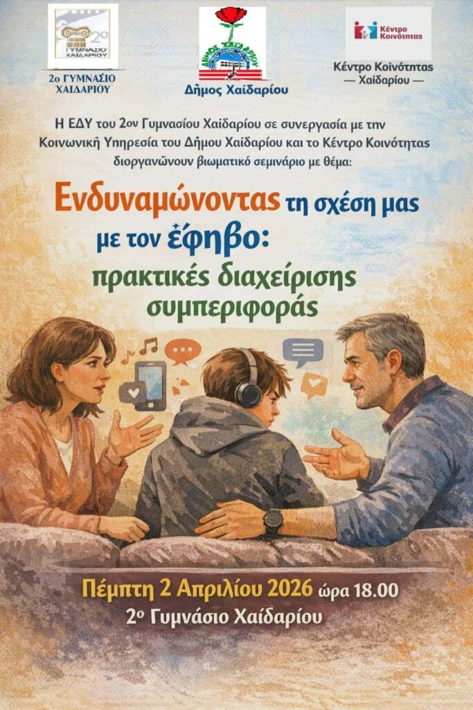 Η Επιτροπή Διεπιστημονικής Υποστήριξης του 2ου Γυμνασίου Χαϊδαρίου σε συνεργασία με την Κοινωνική Υπηρεσία του Δήμου Χαϊδαρίου και το Κέντρο Κοινότητας, διοργανώνουν βιωματικό εργαστήριο με θέμα: Ενδυναμώνοντας τη σχέση μας με τον έφηβο. Πρακτικές διαχείρισης συμπεριφοράς.
