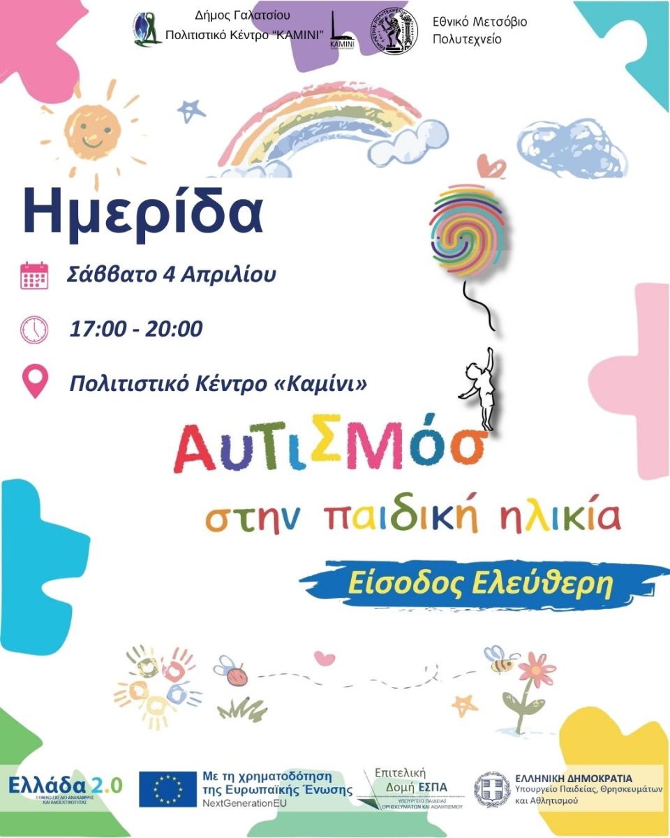 Σας προσκαλούμε στην ενημερωτική ημερίδα με θέμα «Αυτισμός στην παιδική ηλικία», που θα πραγματοποιηθεί το Σάββατο 4 Απριλίου, από τις 17:00 έως τις 20:00, στο Πολιτιστικό Κέντρο «Καμίνι».