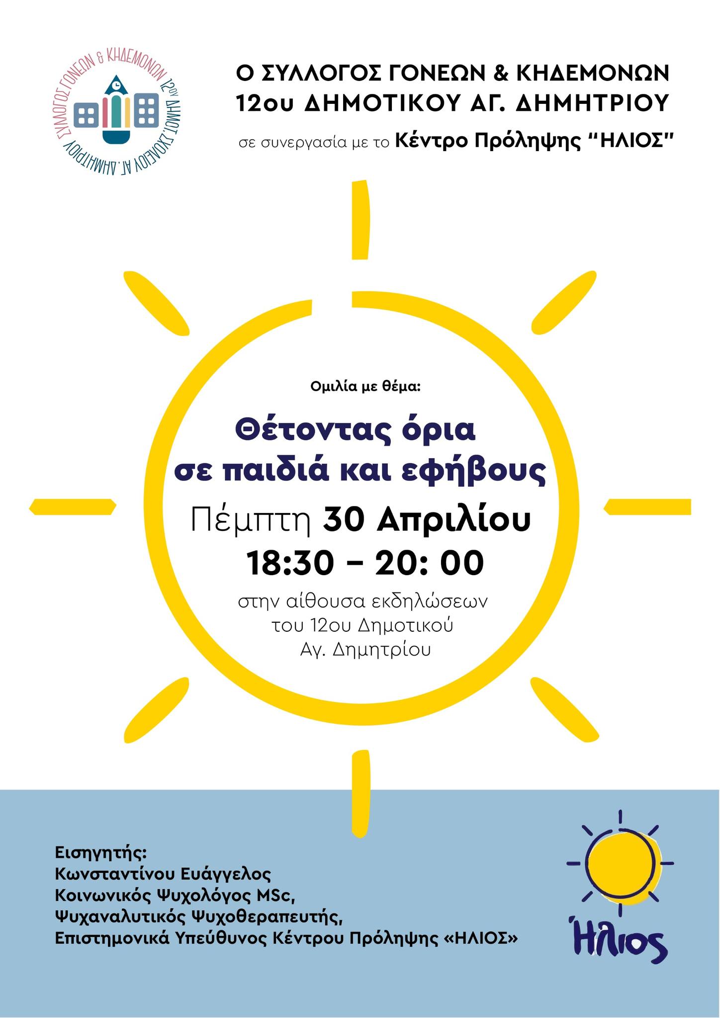 Την Πέμπτη 30 Απριλίου 2026 και ώρα 18:30 θα πραγματοποιηθεί ομιλία – συζήτηση με γονείς και παιδαγωγούς στο χώρο του 12ου Δημοτικού Σχολείου του Αγίου Δημητρίου (Ευρώτα 28) με θέμα: «Θέτοντας όρια σε παιδιά και εφήβους».
