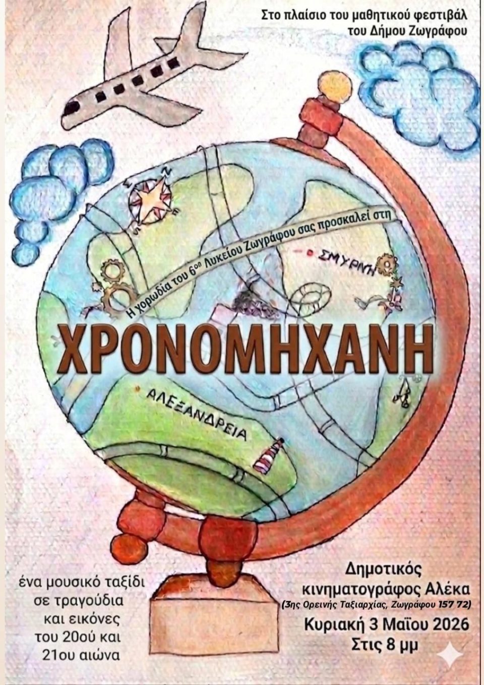 🎶Η συναυλία της μαθητικής χορωδίας με τίτλο “ΧΡΟΝΟΜΗΧΑΝΗ” θα πραγματοποιηθεί στον Δημοτικό Κινηματογράφο “ΑΛΕΚΑ” στις 3 Μαΐου 2026 και ώρα 20:00.