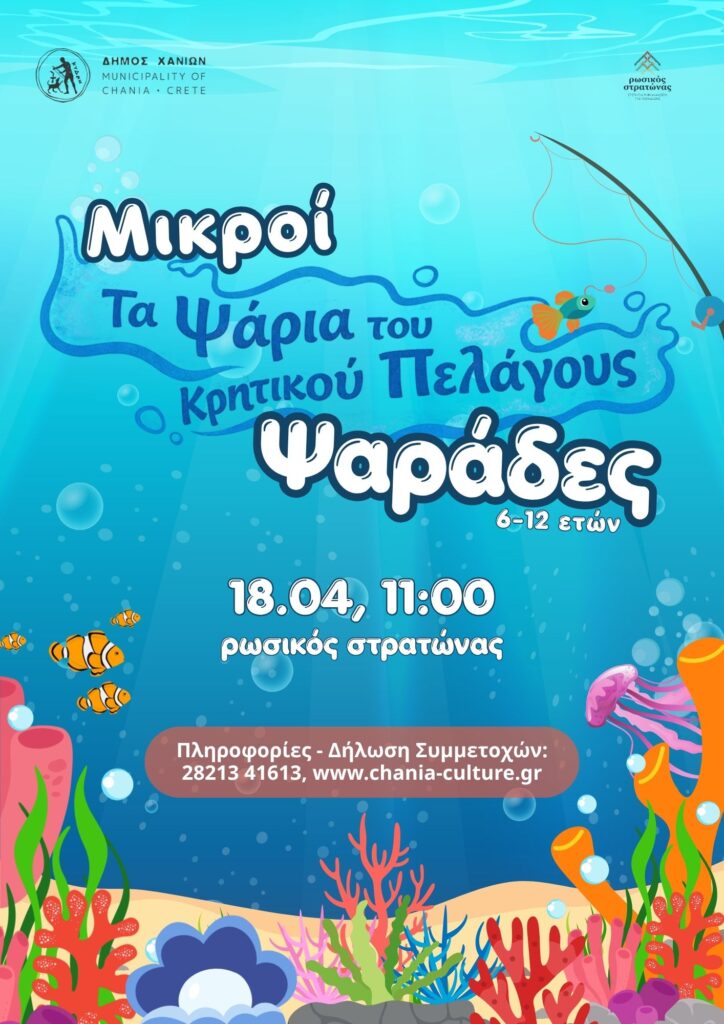 Το Σάββατο 18 Απριλίου 2026 και ώρα 11:00 στον χώρο του Ρωσικού Στρατώνα, τα παιδιά θα έχουν την ευκαιρία να γνωρίσουν τον κόσμο του ψαρά και να εξερευνήσουν τα ψάρια που ζουν στο Κρητικό Πέλαγος.