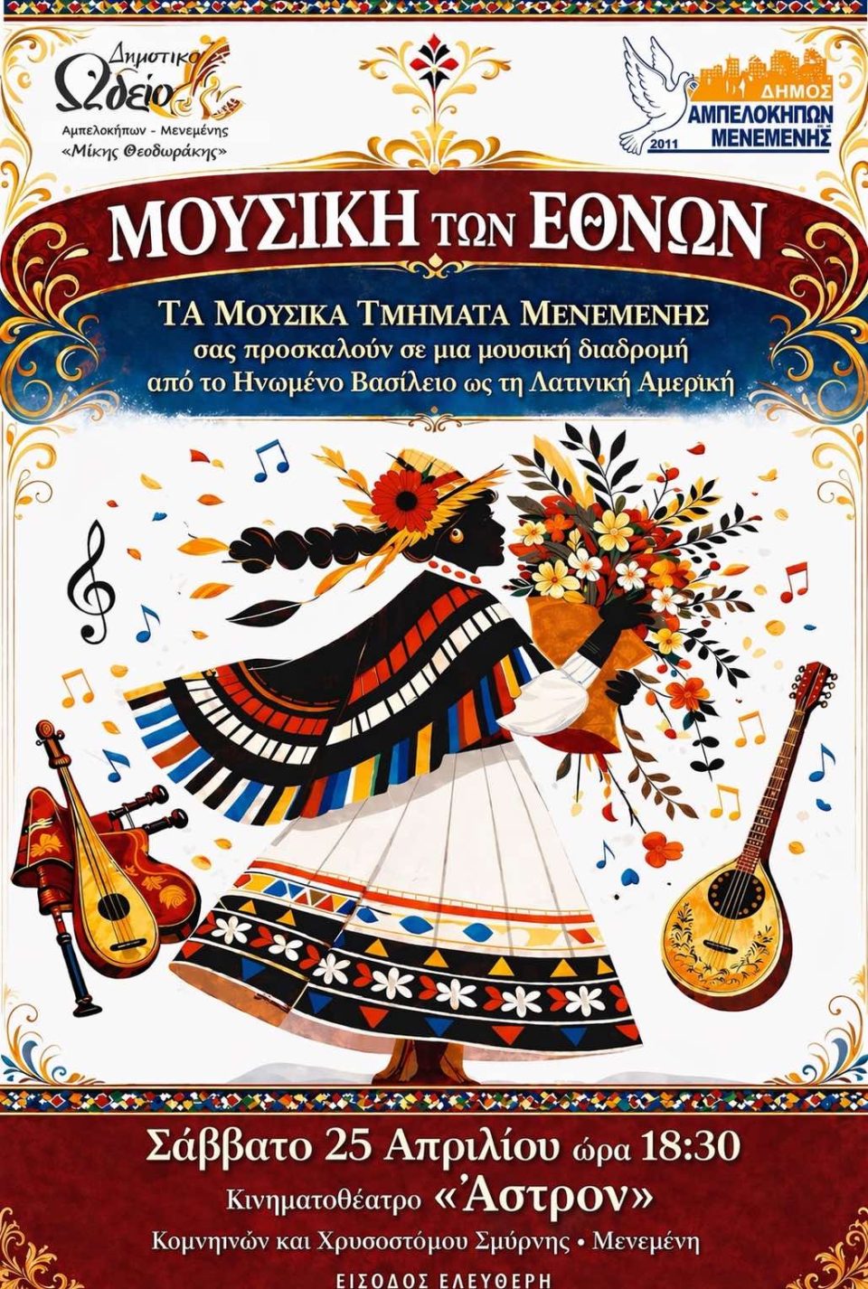 Ο Δήμος Αμπελοκήπων-Μενεμένης και το Δημοτικό Ωδείο Αμπελοκήπων – Μενεμένης «Μίκης Θεοδωράκης» σας προσκαλεί σε ένα πολυπολιτισμικό μουσικό ταξίδι γεμάτο ρυθμό, μελωδία και δημιουργική έκφραση, στην τελική εκδήλωση των μουσικών τμημάτων Μενεμένης, με τίτλο «Μουσική των Εθνών».